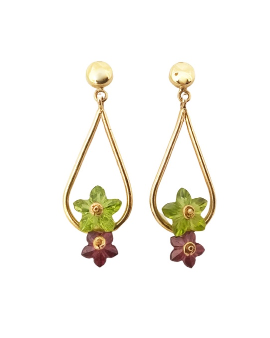 Original oval wire earrings with 4 peridots and 2 garnets cut in the shape of a flower, mounted in 750 (18 carat) yellow gold. Safety catch clasps. Original and timeless designer jewel in limited edition. Untreated natural stones.