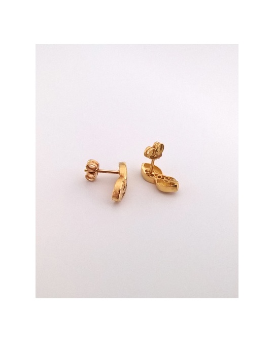 Pendientes forma Infinito en oro amarillo 750 (18 quilates), engarzados con 5 circonitas en cada pendiente. Joya discreta y atemporal, muy agradables de llevar, fabricación artesanal. Cierres presión con tope de seguridad, gruesos.