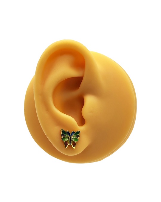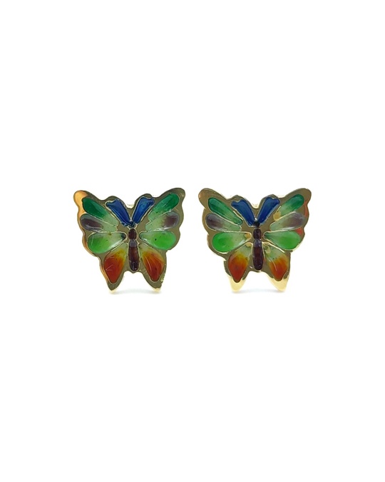 Bonitos pendientes en oro amarillo de 18 quilates, forma mariposa en esmalte al fuego multicolor. Macizas, hechas a mano, pequeñas y discretas, planas, muy agradables de llevar. Fabricación de gama alta, colección en exclusiva Arior.