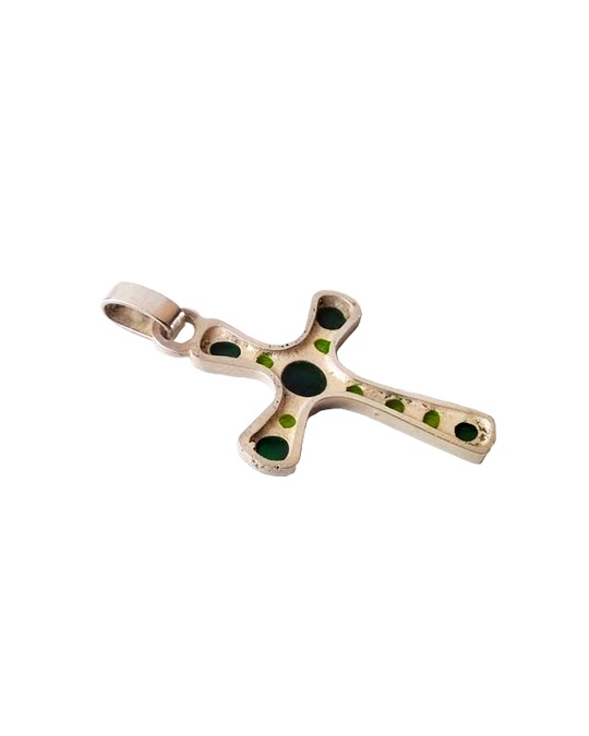 Croix en argent massif 925 millièmes et émaux verts, fait main, bijou mixte, la finition donne l'impression que la croix est ancienne, fabrication artisanale.