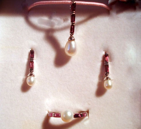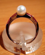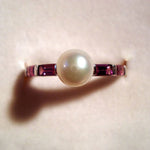 Ravissante petite bague en or blanc 750 millièmes (18 carats), sertie d'une perle de culture blanche et de quatre rhodolites taille baguette. Sertissage barrette, n'accroche pas, fabrication artisanale, bijou intemporel et discret. Fabrication française.