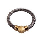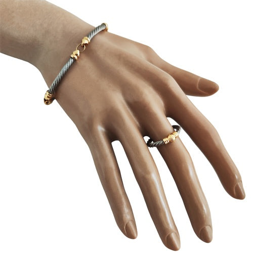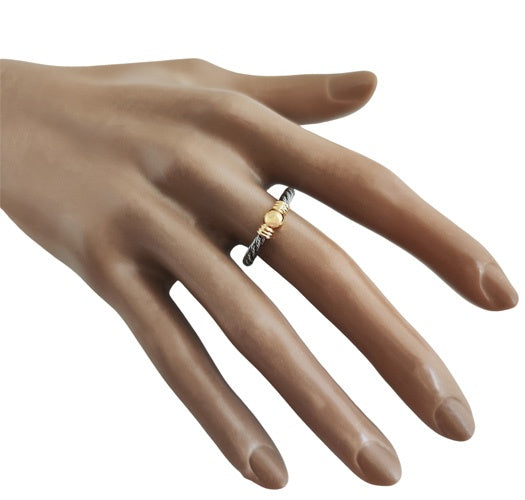 Bague boule en acier et or jaune 750 (18 carats), le câble est monté à la main et le motif or est massif et soudé, fabrication artisanale haut de gamme.