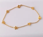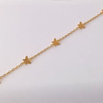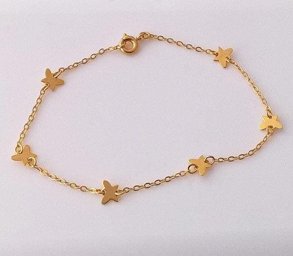 Ravissant petit bracelet fin motif 6 papillons, or jaune 750 (18 carats), maille forçat rond, fermoir anneau ressort, bijou minimaliste et discret pour jeunes filles et femmes à poignet fin. Le collier assorti existe aussi.
