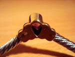Bracelet câble en acier et or jaune 750 (18 carats), serti d'une améthyste taille poire, le câble est  monté à la main et les parties en or sont massives et soudées, fermoir mousqueton fabrication haut de gamme fait main garantie, ne bouge pas, article tout terrain ! Collection en exclusive, s'adapte à presque tous les poignets.
