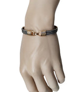 Bracelet homme 3 câbles en acier et or jaune 750 millièmes (18 carats), modèle godrons, discret, toutes les parties en or sont massives et soudées, fabrication haut de gamme fait main garantie, ne bouge pas, article tout terrain. Collection en exclusive, s'adapte à presque tous les poignets.