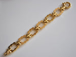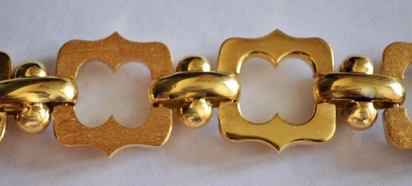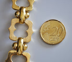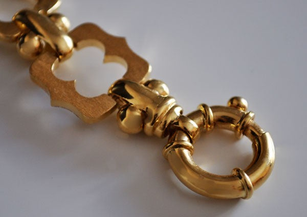 Magnifique bracelet pour femme en or jaune 750 millièmes (18 carats), large et plat, maillons satinés et polis alternés, grand fermoir bouée, fabrication artisanale haut de gamme, fort d'or, modèle original de joaillerie en édition limitée, collection en exclusive.