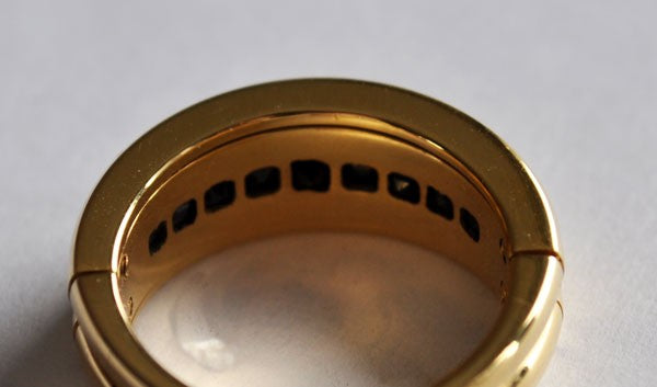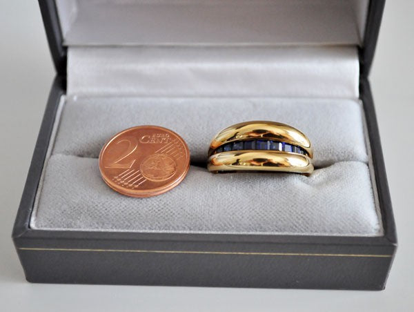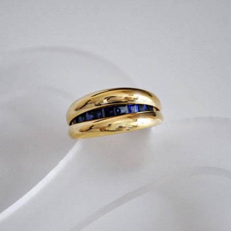 Originale bague modèle Sourire forme jonc, massive, sertie de 9 saphirs de 1er choix taille carrée. Pierres naturelles parfaitement calibrées, montée en or jaune 750 millièmes (18 carats), serti rail, n'accroche pas, anneau en chute (ne gêne pas au doigt), très agréable à porter, fabrication haut de gamme fait main.