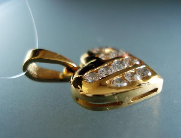 Ravissant pendentif en forme de coeur, serti de dix oxydes de zirconium (sertissage rail), n'accroche pas les vêtements, fabriqué en or jaune 750 millièmes (18 carats), finition poli brillant.