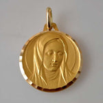 Beautiful 18k yellow gold (750/1000) medal, solid, round, depicting the Virgin Mary facing forward with a veil, matte finish and scalloped edge, a classic piece of jewelry ideal for baptisms, communions, etc. Handcrafted in France, starting at 14 mm. Free engraving!