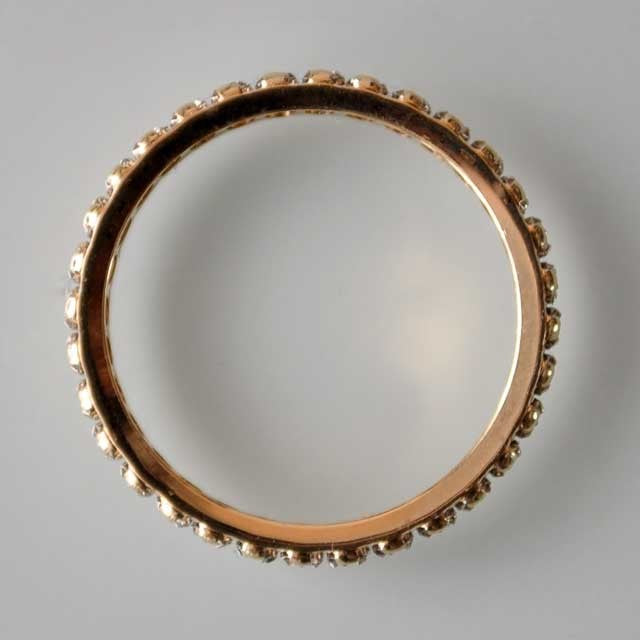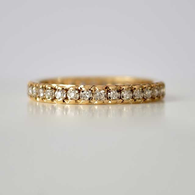 A very pretty, full eternity wedding band, set with diamonds, two-tone, crafted in 18k yellow gold (750), rhodium-plated setting, solid, flat. A very comfortable ring to wear, with an "illusion" setting, a timeless and chic piece. Made in France.