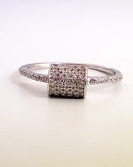 Ravissante petite bague en argent massif 925 rhodié, forme cylindre, oxydes de zirconiums imitation diamant, serti grain, n'accroche pas. Bijou discret et moderne, très bel éclat, très agréable à porter, fait beaucoup d'effet.