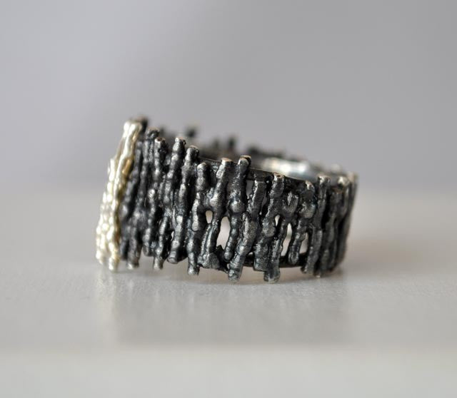 Originale bague modèle Diluvi Oxid en argent massif 925 vieilli et centre mat, bijou mixte pour homme ou femme, à décliner également comme alliance. Fabrication artisanale haut de gamme Arior.