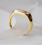 Bague pour homme forme asymétrique, or 750 millièmes (18 carats) bicolore, la partie grise est en or jaune rhodié, bague sertie d'un diamant rond taille brillant de 1r choix, serti clos n'accroche pas. Fabrication française haut de gamme Orest. Pour d'autres tailles merci de nous contacter.