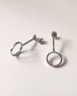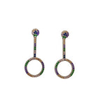 Originales boucles d'oreilles modèle Cercle avec barrette rigide, argent 925 rhodié, camaïeu de zirconiums multicolores bleu, vert, violet, rose, orange et jaune, serti grain, n'accroche pas, très agréables à porter, fermoirs poussettes. Bijou chic, moderne et tendance à porter avec toutes vos tenues.