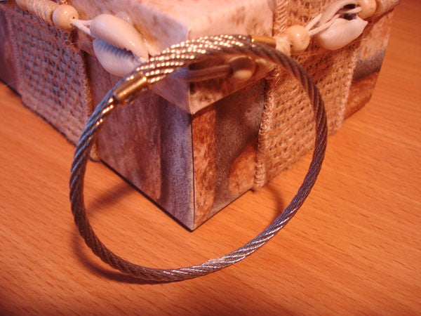 Bracelet câble mixte ouvert en acier et or jaune 750 millièmes (18 carats), le câble est  monté à la main et les parties en or sont massives et soudées, souple, fabrication garantie, ne bouge pas, article tout terrain !