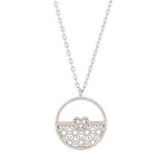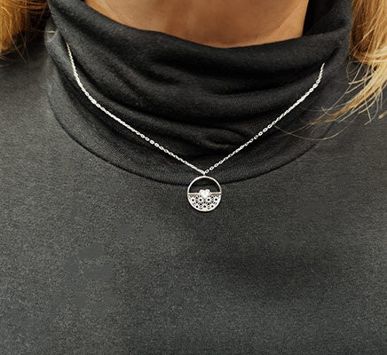 Collier cercle en argent 925 rhodié (ne noircit pas), fleurs ajourées et coeur serti de zirconiums. Chaine fine maille forçat, fermoir anneau ressort. Bijou discret et intemporel, idée cadeau de Saint-Valentin, ras de cou.